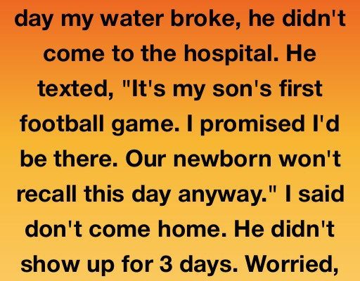 I was pregnant with my first child, my husband has three. The day my water broke, he didn’t come to the hospital. He texted, “It’s my son’s first football game.I …