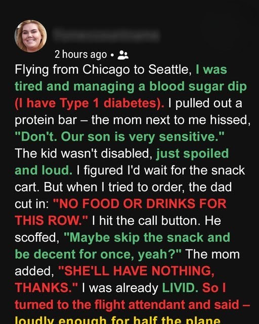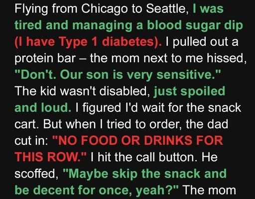 Never in my life did I think I’d have to fight for my right to eat a protein bar on a plane. But when faced with entitled parents who valued their son’s tantrum-free flight over my health, I refused to back down. What happened next left the entire row speechless.