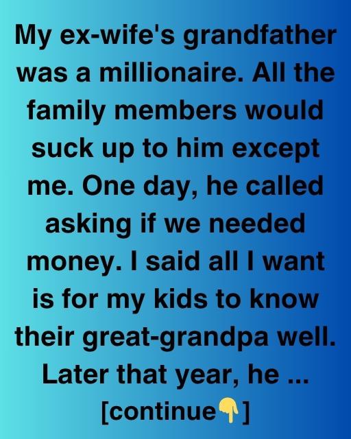 My ex-wife’s grandfather, Orville, was the sort of man everyone assumed was stoic and distant—but beneath his reserved exterior beat the heart of someone who had lived through more stories than most of us will ever know. He’d quietly amassed a fortune, yet few of his relatives cared about the person behind the wealth; they saw only a bank account, not the gentle soul who’d weathered life’s storms. I never played that game.