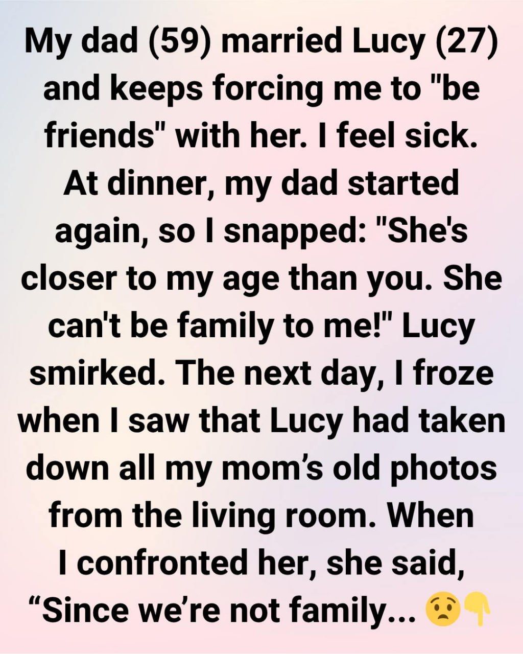 The guilt was overwhelming. He was right. He deserved happiness. And she did seem nice. She always made an effort, asked about my day, remembered little details. She wasn’t malicious. She was just… there. And she was my age.