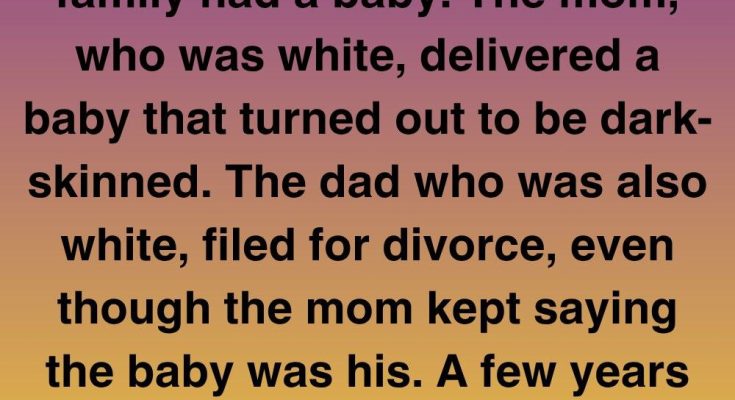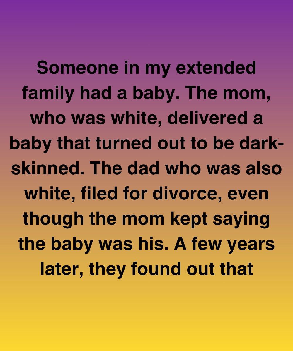Someone in my extended family had a baby. The mom, who was white, delivered a baby that turned out to be dark-skinned. The dad who was also white, filed for divorce, even though the mom kept saying the baby was his.