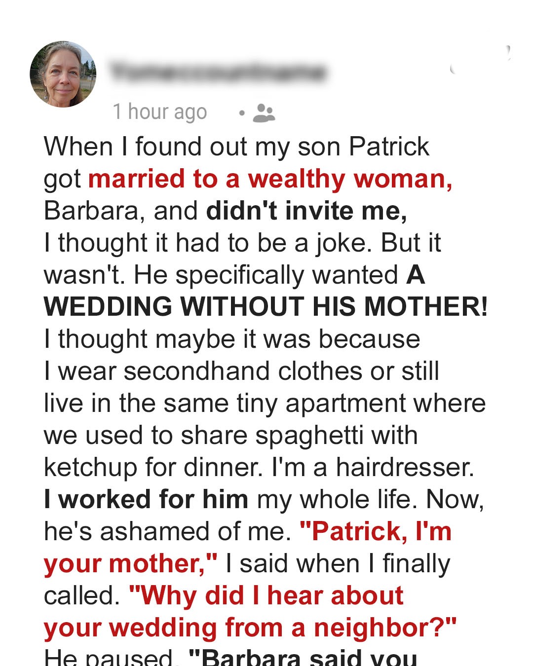 “Patrick, honey, don’t forget Sunday coffee this week,” I called out to him a few months ago, watching him fidget with his phone.“Actually, Mom, I might be busy this Sunday.”“Busy? Since when are you too busy for your old mother?”“I’ve been seeing someone.” His eyes never left the screen.My heart jumped. “Someone? What’s her name? When do I get to meet her?”“Barbara. And she’s… different. Her family has money. Real money.”