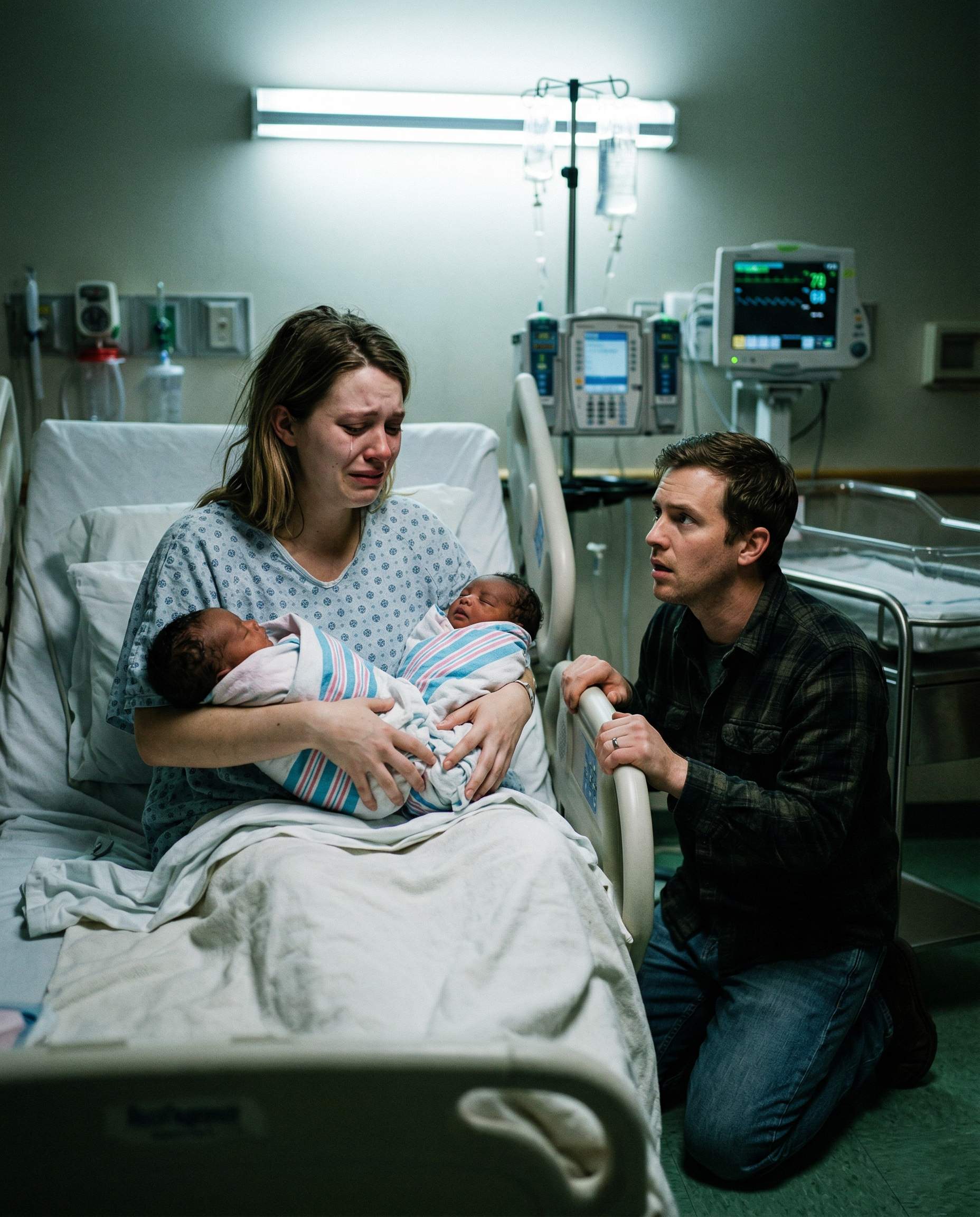 Anna was there, hospital lights harsh above her, clutching two tiny bundles hidden behind their blankets.