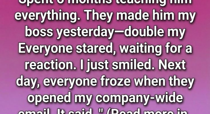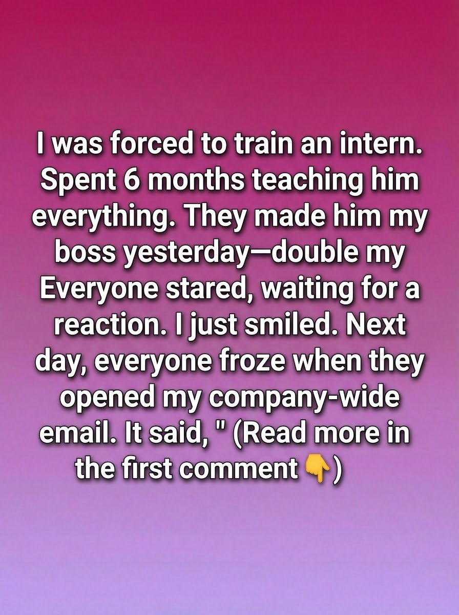 The morning the announcement was made, I sat at my desk with a polite smile frozen on my face. For six months, I had trained a new intern named Ryan, teaching him every process, introducing him to clients, and walking him through tasks I had mastered over years. I had been told it was a temporary mentorship assignment, a way to “support the next generation.” So when management announced that Ryan was being promoted to my supervisor, complete with a salary twice my own, the office fell silent