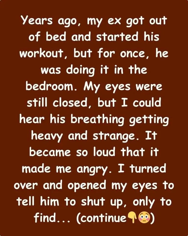 Years ago, my ex-boyfriend got out of bed and started his morning workout, but for once, he was doing it in the bedroom.My eyes were still closed, but I could hear his breathing getting heavy and strange.
