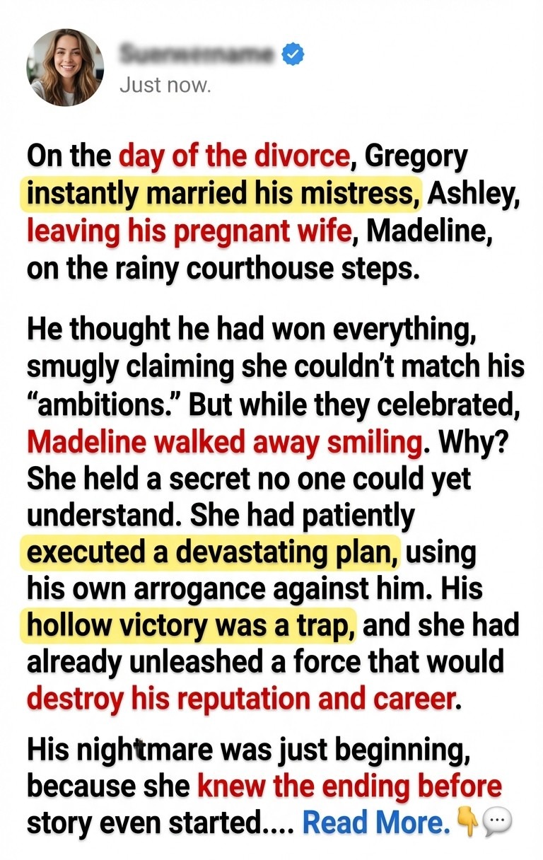 Silence can be the loudest warning, yet he was too arrogant to hear it. The day of the divorce, he married his mistress, while his pregnant wife walked away smiling with a secret no one could yet understand. He believed he had won, taking everything he ever wanted, completely unaware that his perfect new beginning was actually the final act of his downfall.
