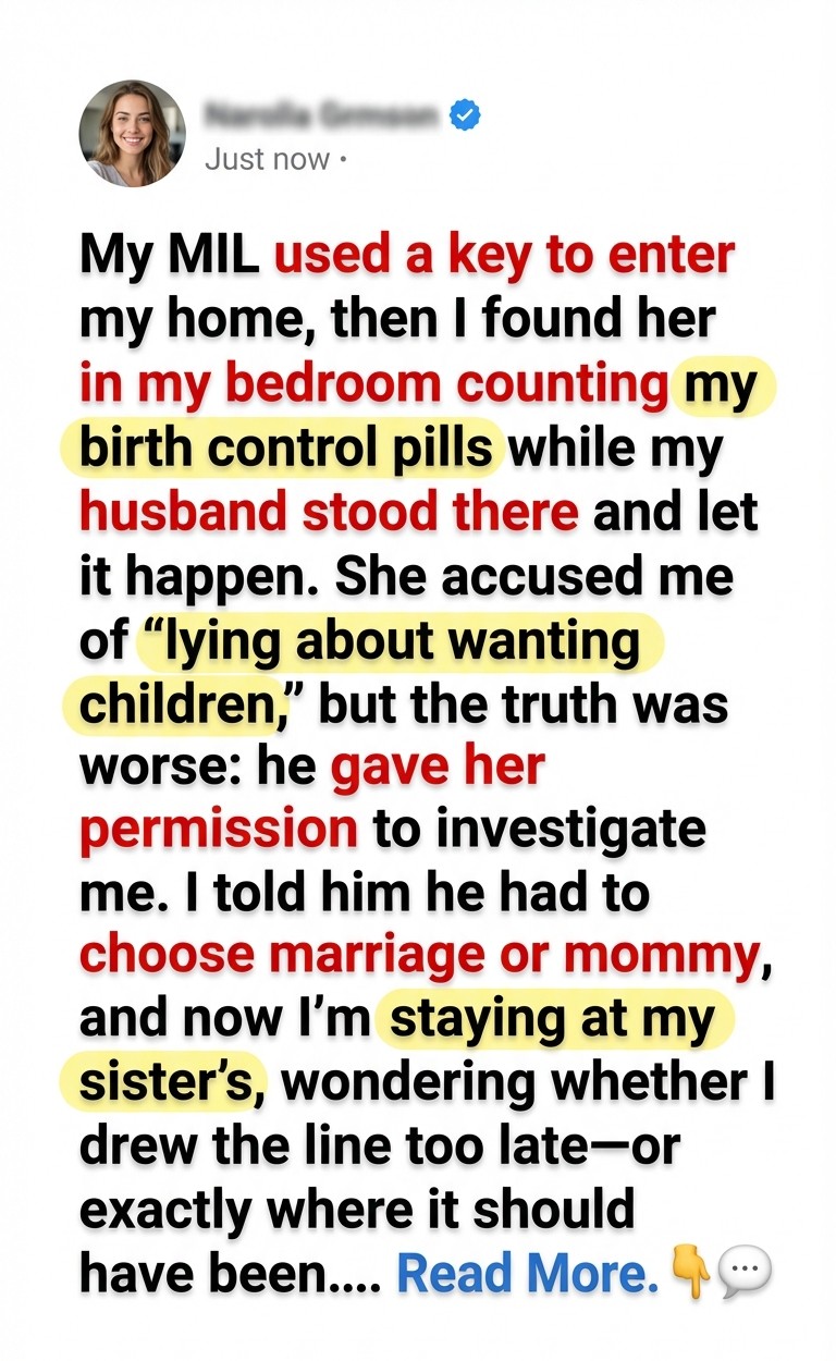 That was the moment my heart did something strange and painful. It did not break all at once. It went very still. Because sometimes the body knows before the mind can catch up that betrayal has crossed a line so deep there is no easy way back from it. My husband, the person who was supposed to be my partner, was standing there as if this were normal. As if his mother counting my birth control pills in my bedroom was a reasonable family matter. As if my body, my choices, and my privacy were community property.