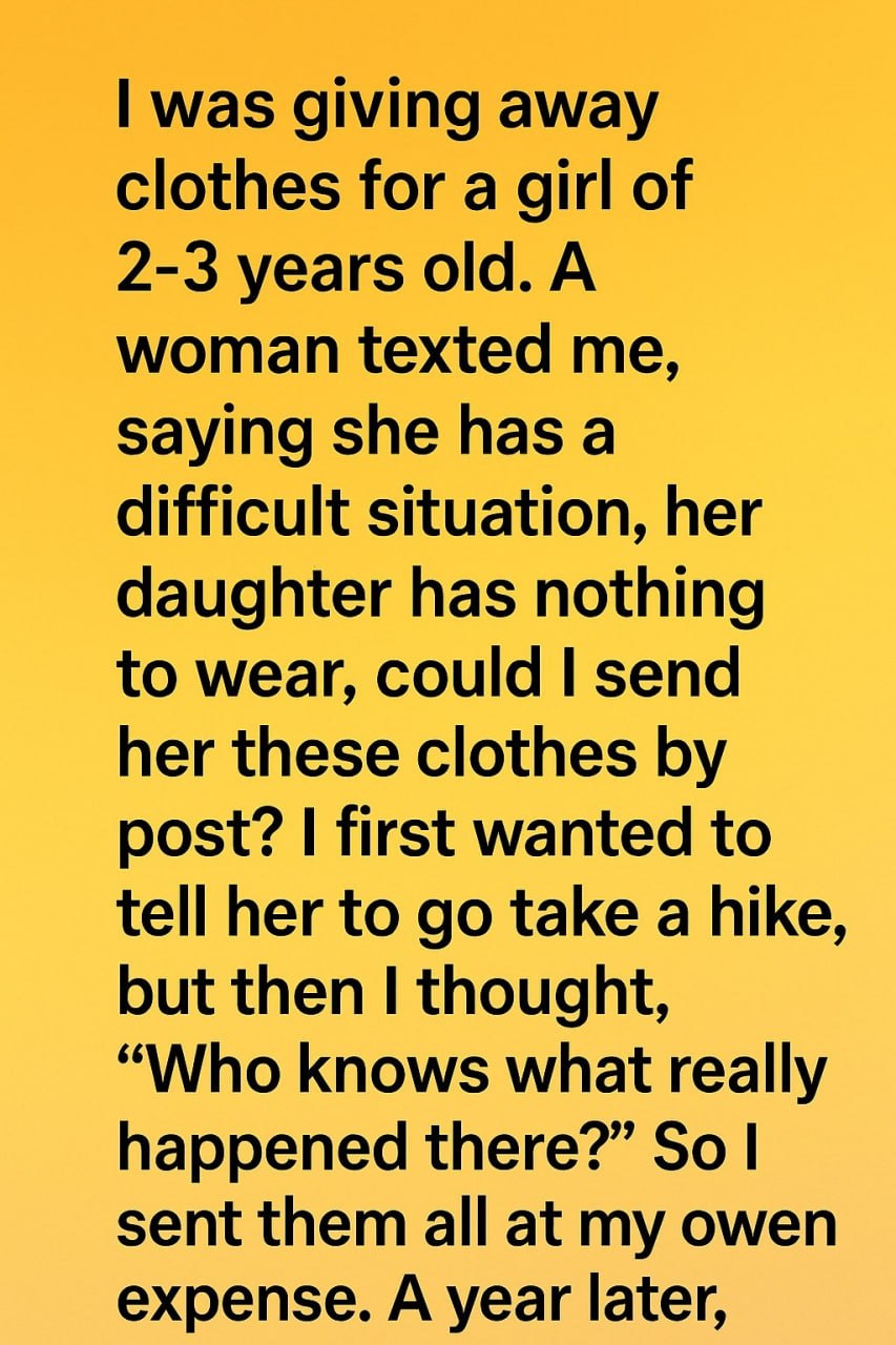 So I boxed them up. Took a photo. Posted online:“Free children’s clothing, size 2–4.Just pay postage.”Dozens replied, but one message lingered on the screen. “My name is Nura. I just left a difficult situation with my daughter.We don’t have much. I can’t pay the postage now… but I’ll send it when I can. If not, I understand.”